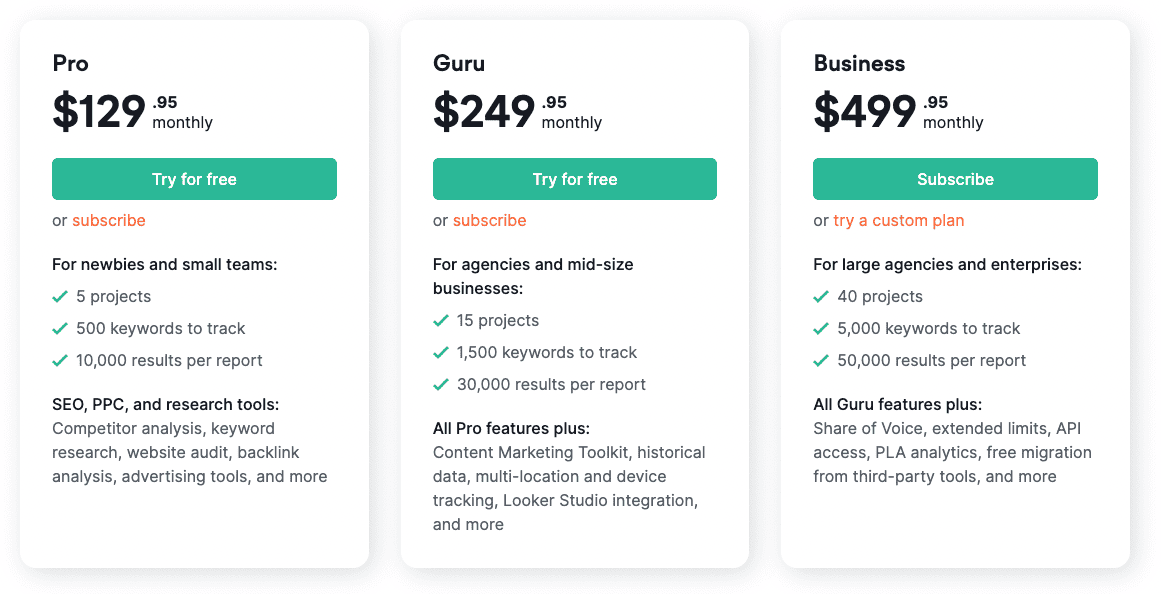 I like Semrush because it checks a lot of boxes as a command center for multiple SEO tasks without requiring a ton of extra integrations. On the downside, it’s expensive, with plans starting from $139.95 per month.